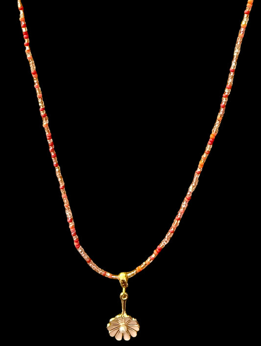 20” Czech Glass Beaded Necklace with Pink Daisy Pendant – Gold Accent & Lobster Clasp