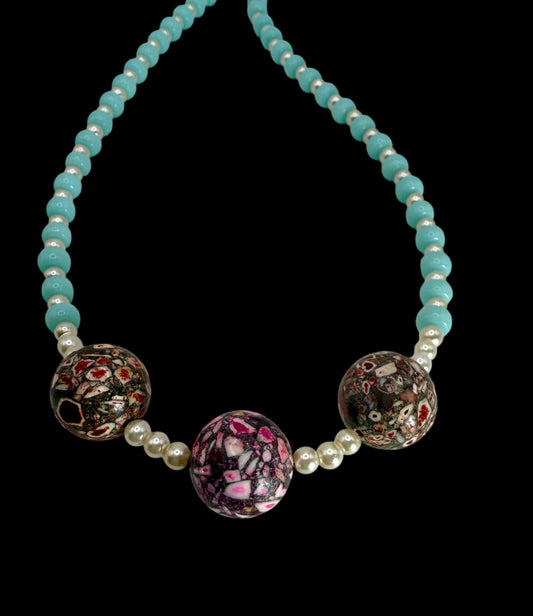 20” Blue Jade Beaded Necklace with Daqi Focal Beads – Unique Statement Jewelry, Bold Mosaic Beads, Handmade Gift for Her