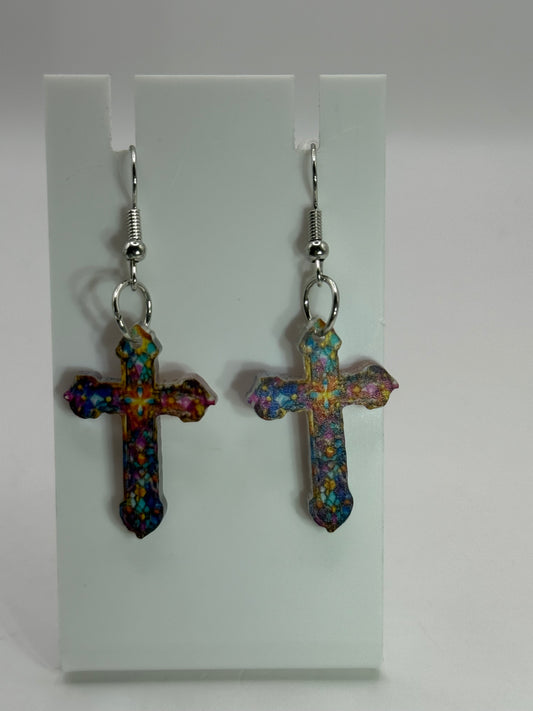 Colorful Mosaic Cross Earrings – Handmade Resin Dangle Jewelry – Unique Boho Gift