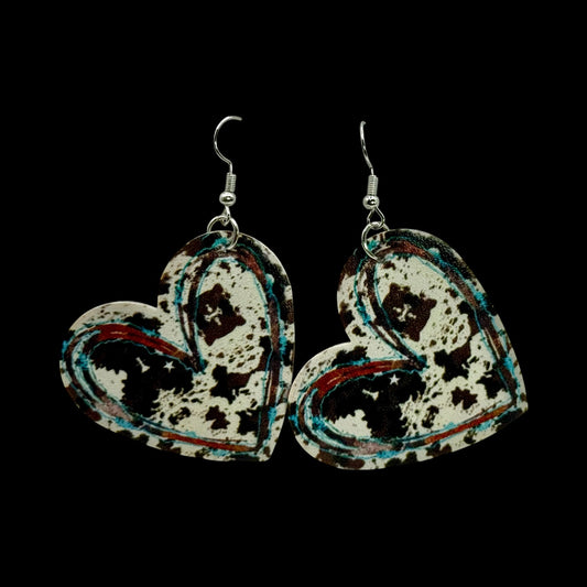 Cowprint Heart Earrings – Faux Leather Dangle Earrings, Western Boho Jewelry, Lightweight Statement Earrings, Gift for Her
