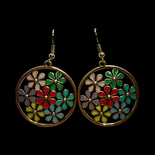 Colorful Flower Hoop Earrings – Boho Dangle Earrings, Retro Floral Jewelry, Statement Earrings, Gift for Her