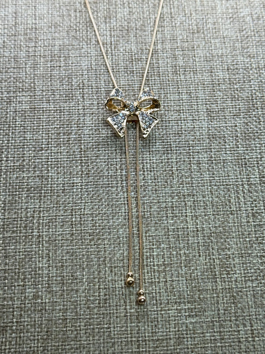 Crystal Bow Pendant Necklace – 22” Gold Chain, Sparkling Ribbon Necklace, Elegant Gift for Her