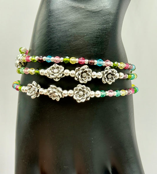 Dainty Flower Wrap Bracelet – Multi-Color Crystal Beads, Silver Floral Accents, Adjustable Memory Wire Bangle