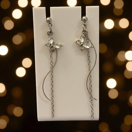 Crystal Butterfly Dangle Earrings – Long Silver Chain Drop Earrings – Elegant Statement Jewelry Gift for Her