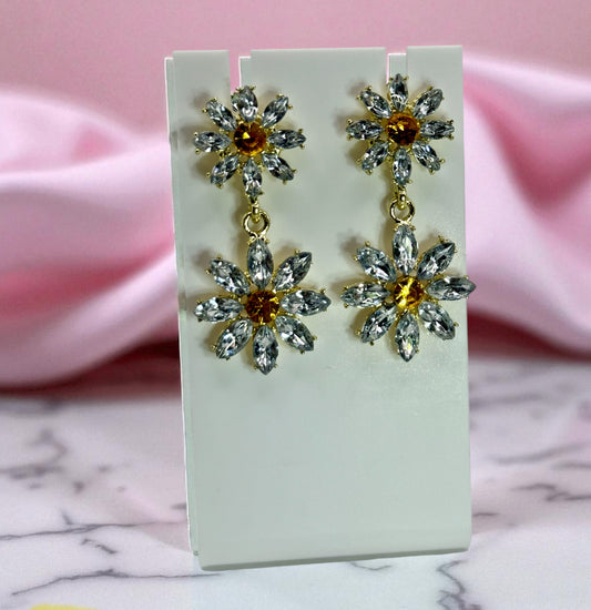 Crystal Daisy Drop Earrings – Yellow Center Flower Earrings, Sparkling Statement Jewelry