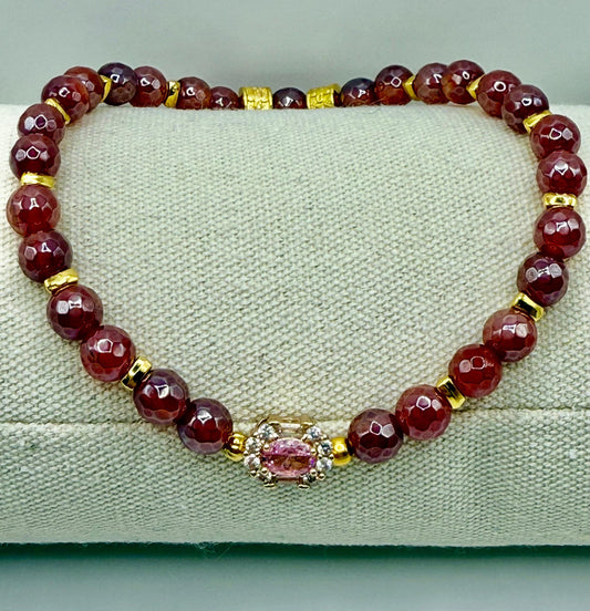 Cranberry Agate Stretch Bracelet with Pink Rhinestone Focal 8"