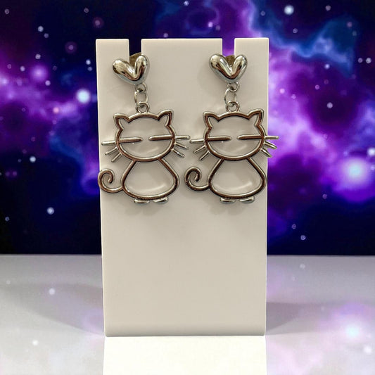 Cute Cat Earrings with Heart Studs – Silver Outline Kitty Dangle Jewelry – Whimsical Cat Lover Gift