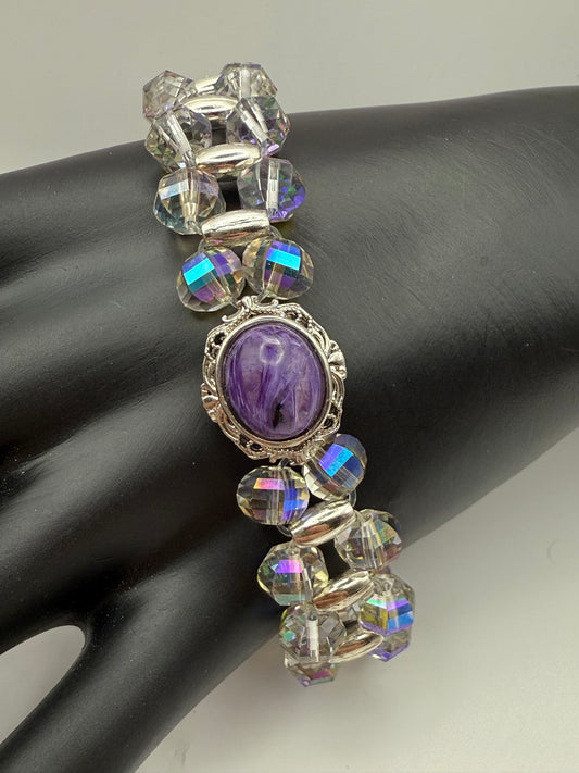 Faceted Disco Cut Double Strand Stretch Bracelet with Charoite Focal 7.50"