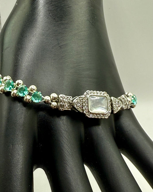 Elegant Rhinestone Bracelet with Mother of Pearl Clasp – 7.75” – Sparkling Silver Tone Jewelry – Statement Bracelet – Gift for Her
