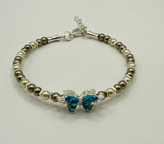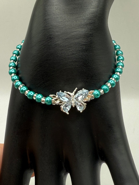 7.5” Teal Glass Pearl Bracelet with Crystal Butterfly – Handmade Gift for Her, Free Resizing Available