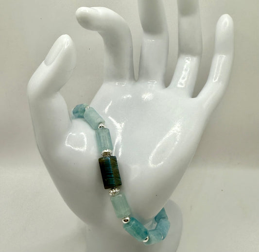 7.75” Aquamarine Bracelet with Labradorite Focal – Silver Accents, Handmade Clasp Jewelry