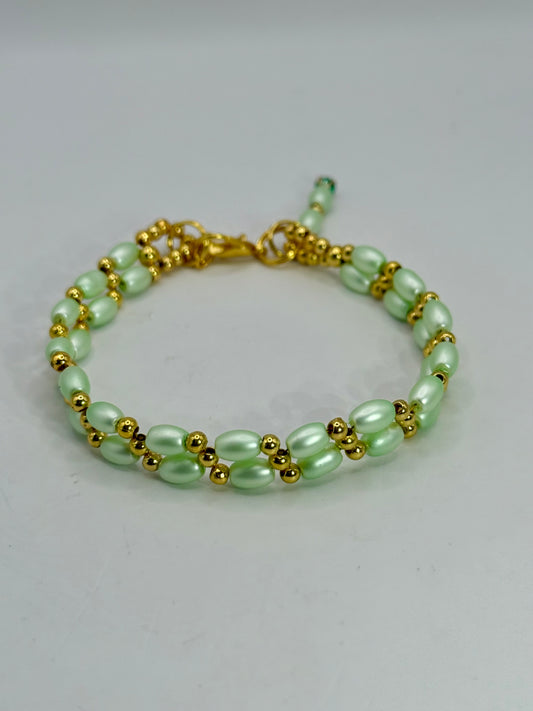 7.5” Double Banded Rice Bead Bracelet with Gold Accents | Mint Green Beaded Jewelry | Handmade Adjustable Bracelet