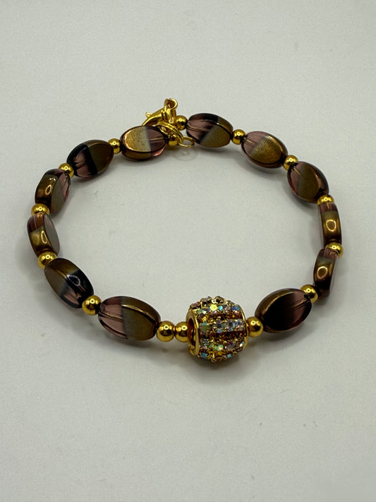 7.5” Gold and Purple Glass Bead Bracelet with Crystal Focal – Handmade Elegant Jewelry Gift