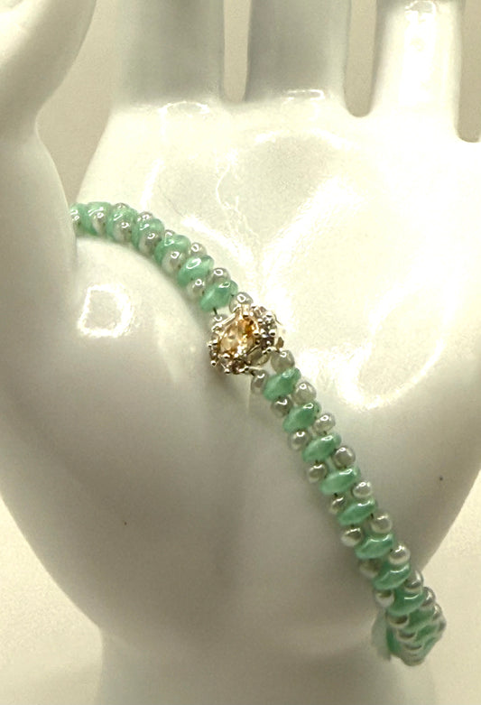 7.5” Mint Green & Glass Pearl Beaded Bracelet with Golden Crystal Focal – Clasp Bracelet