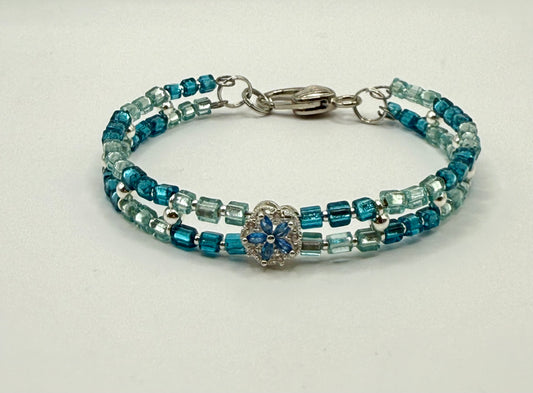 7.5” Aqua & Teal Glass Beaded Bracelet with Silver Flower Focal – Double Strand Clasp Bracelet