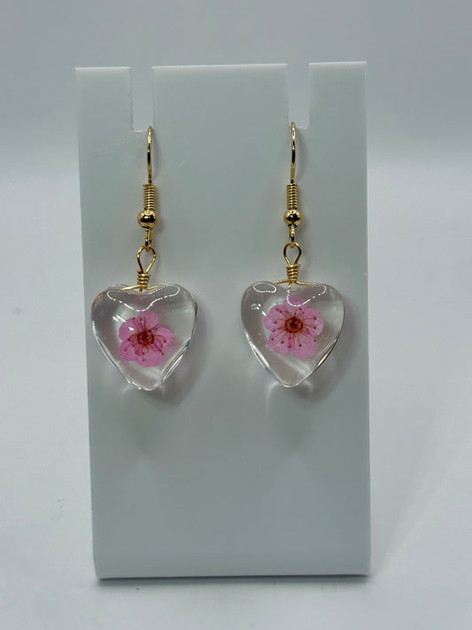 Heart Resin Flower Earrings – Real Pink Blossom Jewelry, Lightweight Dangle Earrings, Romantic Gift for Her