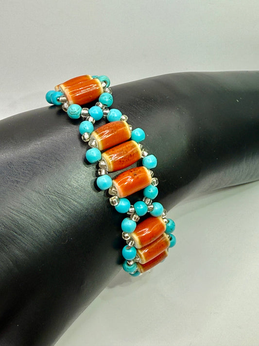 Handmade Turquoise Howlite & Terra Cotta Orange Ceramic Tube Beaded Bracelet – 7.5” Adjustable | Boho Southwest Jewelry