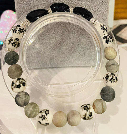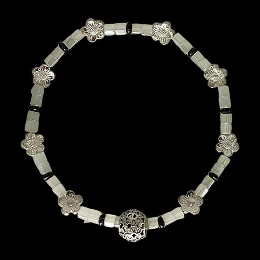 Mother of Pearl with Silver Flower Accents Stretch Bracelet 7.5"