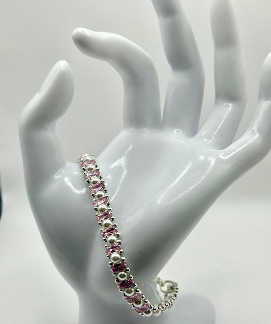 Pink Rhinestone & White Glass Pearl Bracelet – 7.5” – Elegant Clasp Bracelet – Bridal Jewelry – Romantic Gift for Her – Sparkling Statement Bracelet