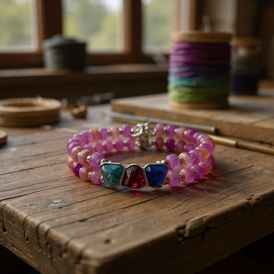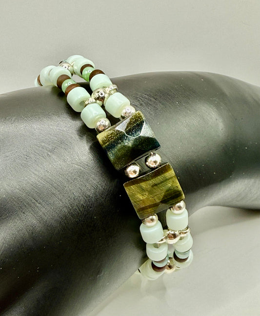 8” Double Banded Beaded Bracelet with Multi-Color Gemstone Focal | Purple Gold Beads | Handmade Jewelry | Free Resizing