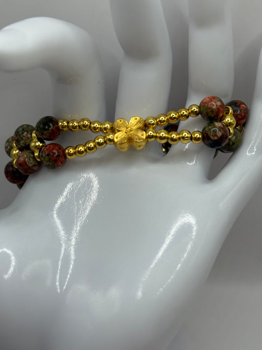 7” Unakite Gemstone Stretch Bracelet with Gold Accents | Free Resizing | Earthy Boho Jewelry