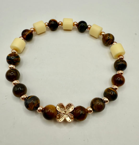 7.75” Tiger Eye & Bodhi Bead Stretch Bracelet with Soft Gold Accents | Handmade Spiritual Jewelry | Free Resizing