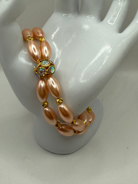 8” Peach Pearl Beaded Clasp Bracelet with Iridescent Crystal Focal – Double Strand Vintage-Inspired Elegance