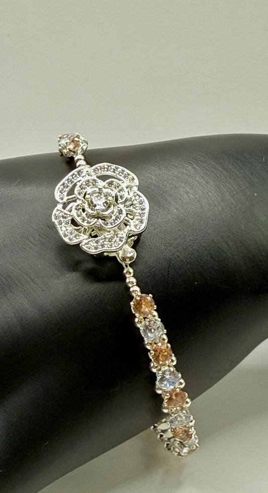 7” Rhinestone Bracelet with Spinner Rose Focal – Elegant Two-Tone CZ Crystal Jewelry
