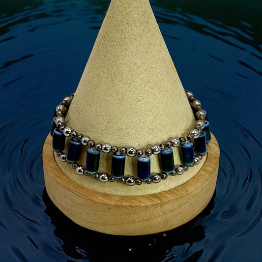 7.75” Double Banded Ceramic Tube Bead Bracelet | Blue Ceramic Beaded Jewelry | Handmade Adjustable Bracelet with Silver Accents