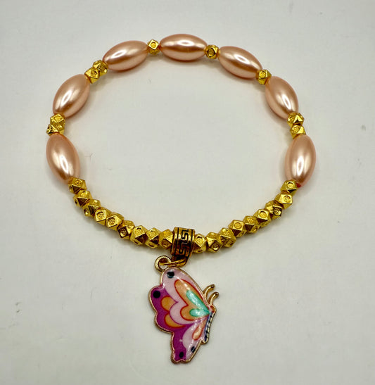 7.75” Peach Glass Bead Stretch Bracelet with Gold Accents – Handmade Jewelry, Free Resizing