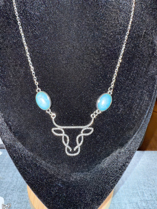 Western Longhorn Necklace with Turquoise Howlite – 18” Silver Chain, Southwest