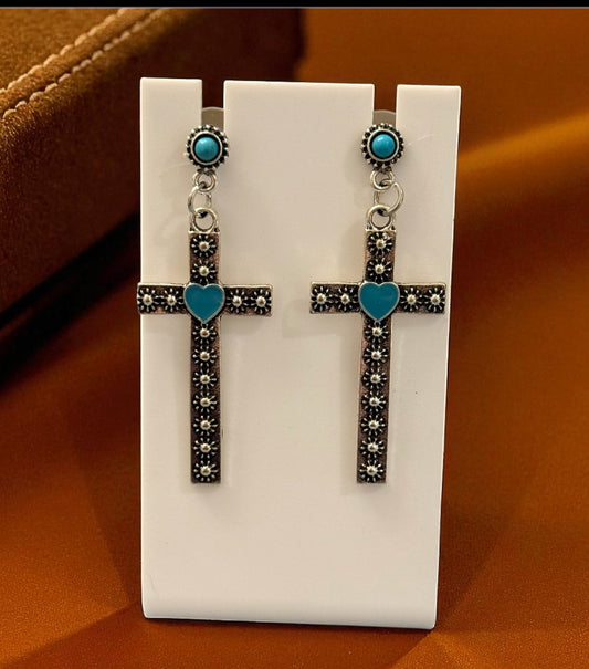 Western Cross Earrings with Turquoise Heart – Vintage Style Dangle Earrings – Faith Inspired Boho Jewelry Gift for Her