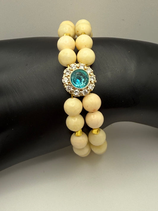 Vibrant Yellow Jade Double Strand Bracelet with Striking Blue Center Focal 7.5"