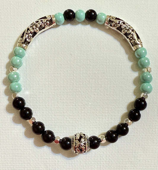 Black Agate and Ocean Stretch Bracelet 8"