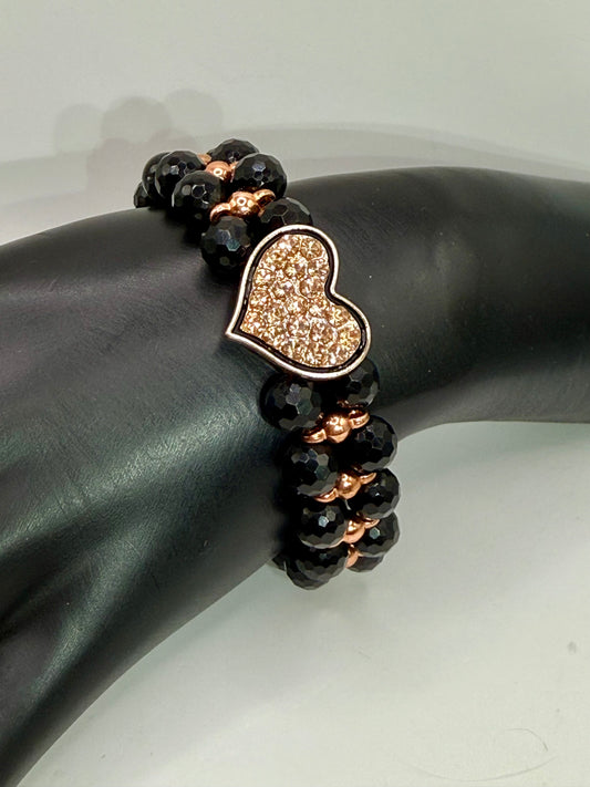 Black Agate and Rose Gold Bracelet – 8” Faceted Gemstone Bracelet with Pavé Crystal Heart Focal, Elegant Handmade Jewelry Gift for Her