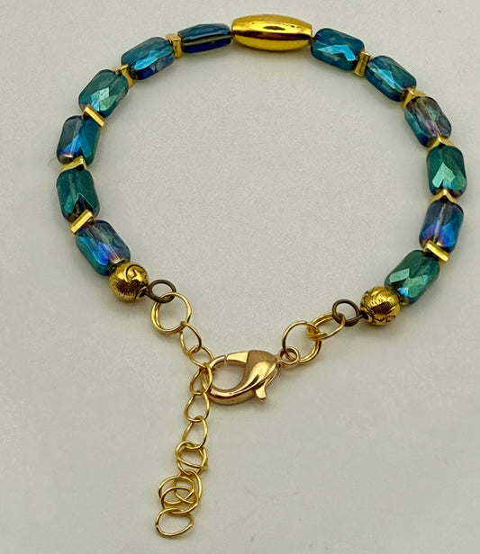 Blue and Green Vitrail Style Bracelet with Pearlescent Bow Focal 7.5"-8"