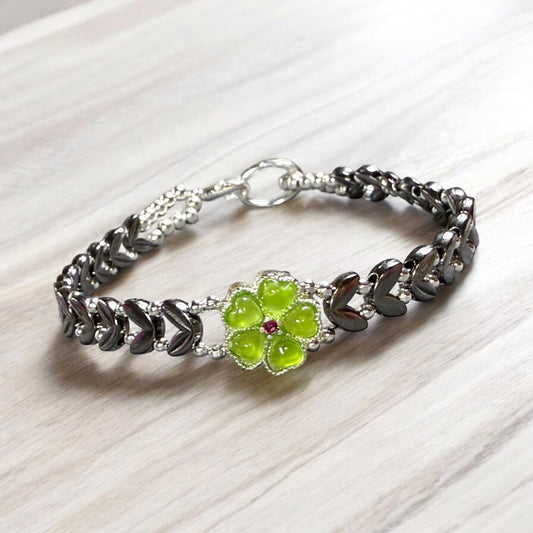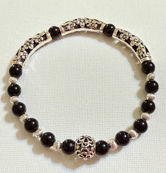 Black Agate and Silver Floral Stretch Bracelet 7.75"