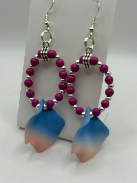 Blue & Pink Petal Drop Earrings – Handmade Beaded Hoops, Statement Dangle Earrings, Colorful Summer Jewelry