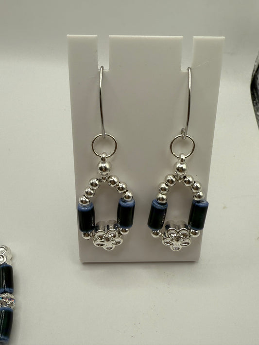 Blue Ceramic Tube Bead Bracelet with Free Matching Earrings – 8” Stretch Bracelet, Handmade Beaded Jewelry Set, Gift for Her