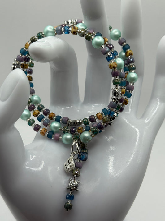 Boho Sea Turtle Wrap Bracelet – Multicolor Glass Bead Memory Wire Bangle – Beach Inspired Jewelry Gift
