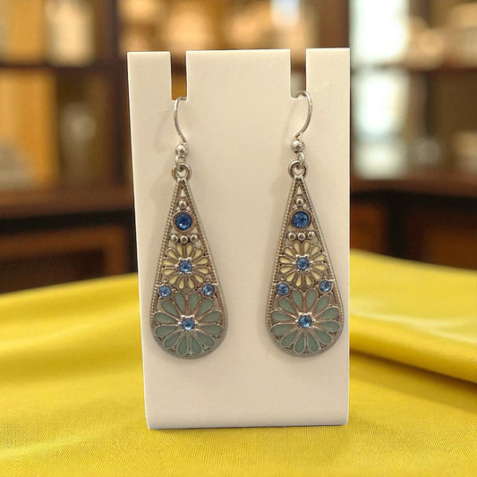 Boho Teardrop Earrings with Blue Crystals | Vintage-Inspired Floral Drop Earrings | Silver-Tone Statement Jewelry | Gift for Her