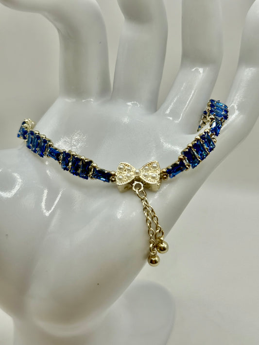 Blue Rhinestone Bow Bracelet – 7.5” – Elegant Crystal Bracelet with Pearl Accent Bow Clasp – Sparkling Gift for Her