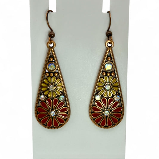 Boho Flower Drop Earrings – Retro Teardrop Earrings with Red & Yellow Enamel, Vintage Style Dangle Jewelry, Gift for Her