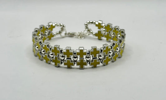 Bold Yellow Cross Link Bracelet – Adjustable 7.5” to 8”, Silver-Tone Double Row Design, Unique Statement Jewelry