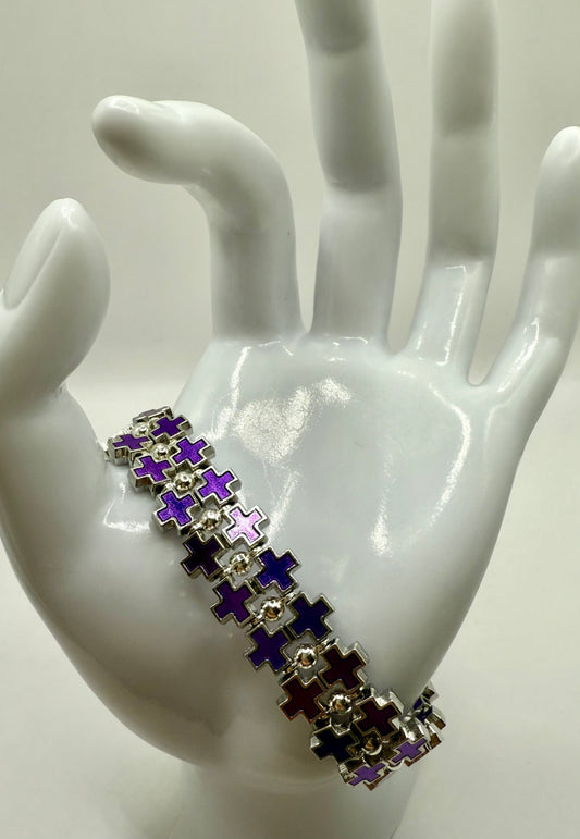 Bold Purple Cross Link Bracelet – Adjustable 7.5” to 8”, Silver-Tone Double Row Design, Unique Statement Jewelry