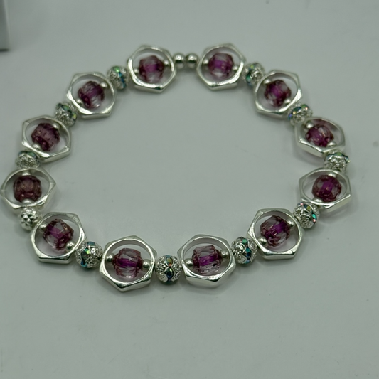 Bright Pink Lantern Bead Bracelet | 7.75” Silver Framed Stretch Bracelet with Complimentary Earrings | Sparkling Handmade Jewelry by LuckyCharm Boutique TX