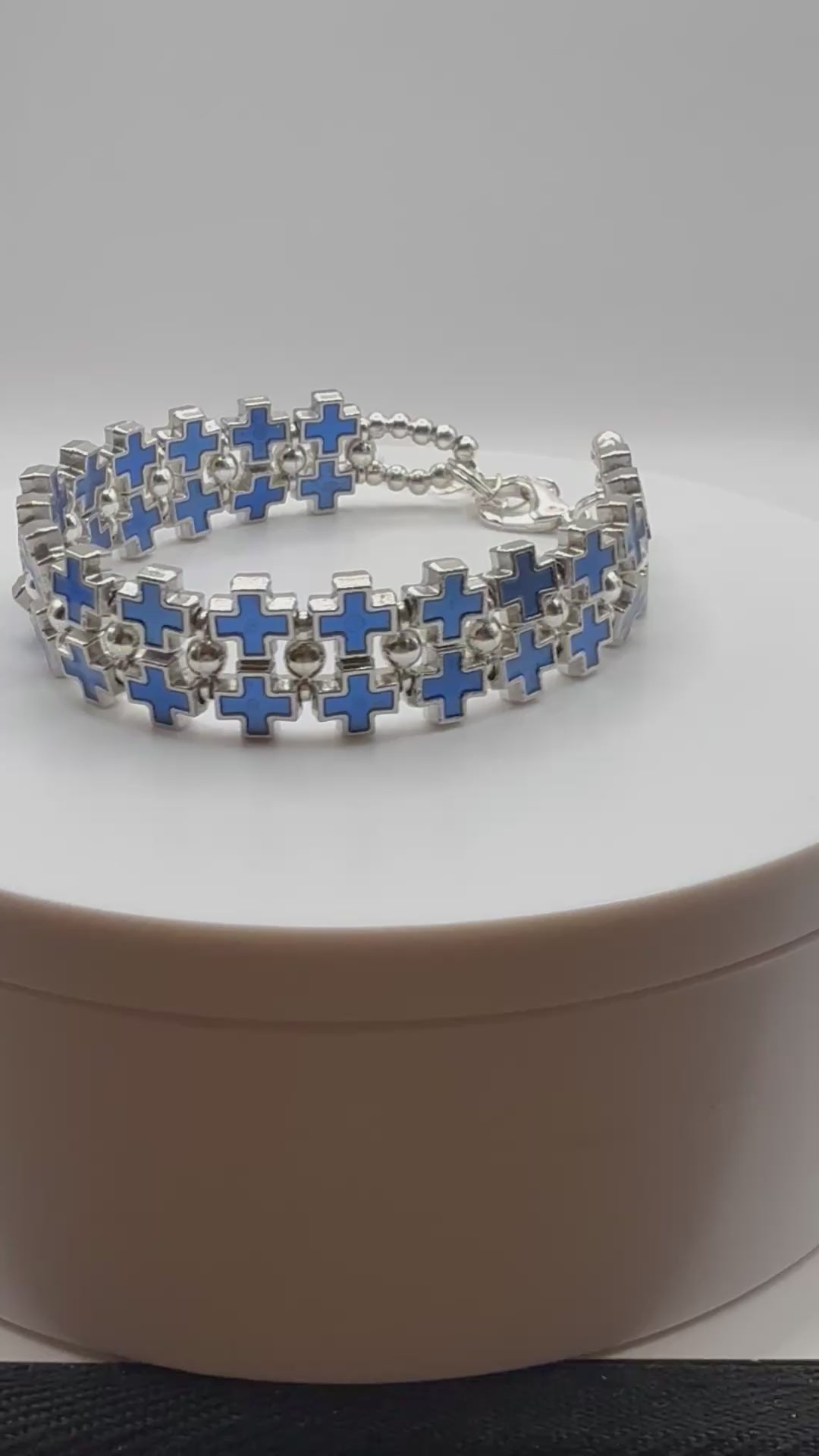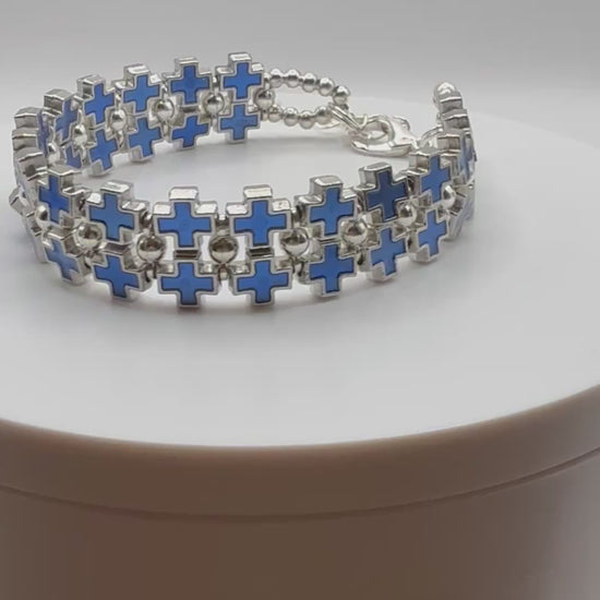 Make a statement with this striking blue cross link bracelet! Featuring double rows of silver-tone metal crosses filled with vibrant blue enamel, this bold yet elegant design is perfect for adding a pop of color to any outfit. The bracelet measures 7.5 inches and includes an extension to 8 inches for a comfortable fit. Its secure clasp and smooth finish make it ideal for everyday wear or special occasions. Whether you’re looking for a meaningful gift or a unique accessory for yourself, this bracelet is sure to stand out.