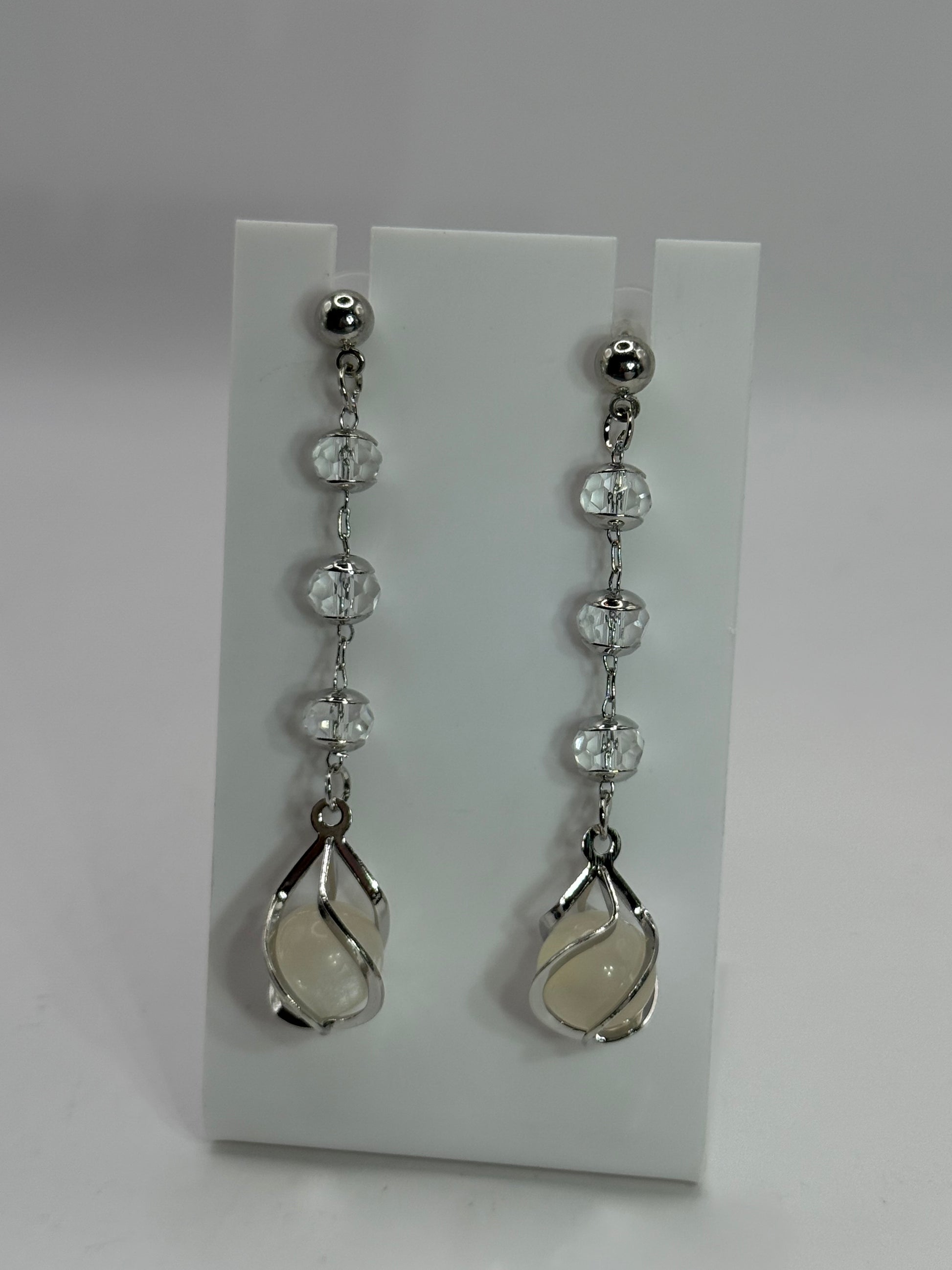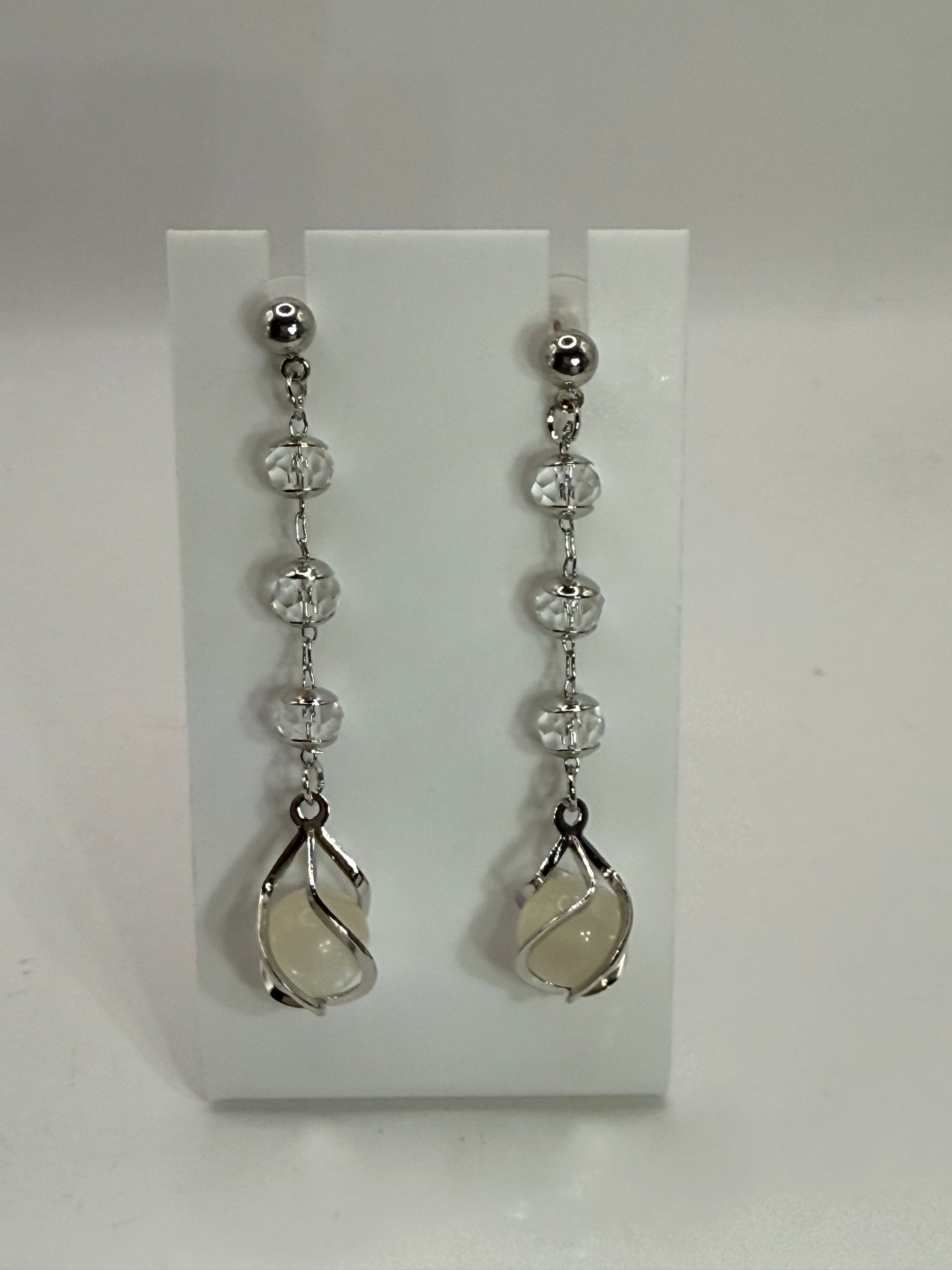 Add elegance and sparkle to your style with these handmade crystal and stone drop earrings. Each earring features three faceted clear crystal beads leading down to a smooth white stone encased in a silver swirl cage. The long dangle design offers just the right amount of movement and shine, making these earrings a beautiful choice for both everyday wear and special occasions.