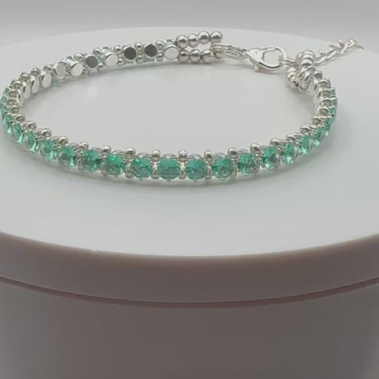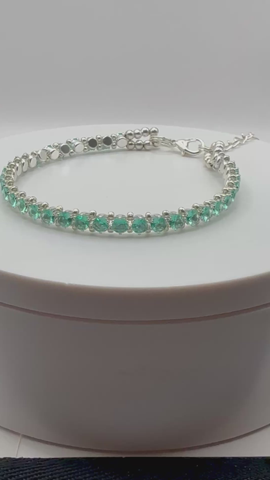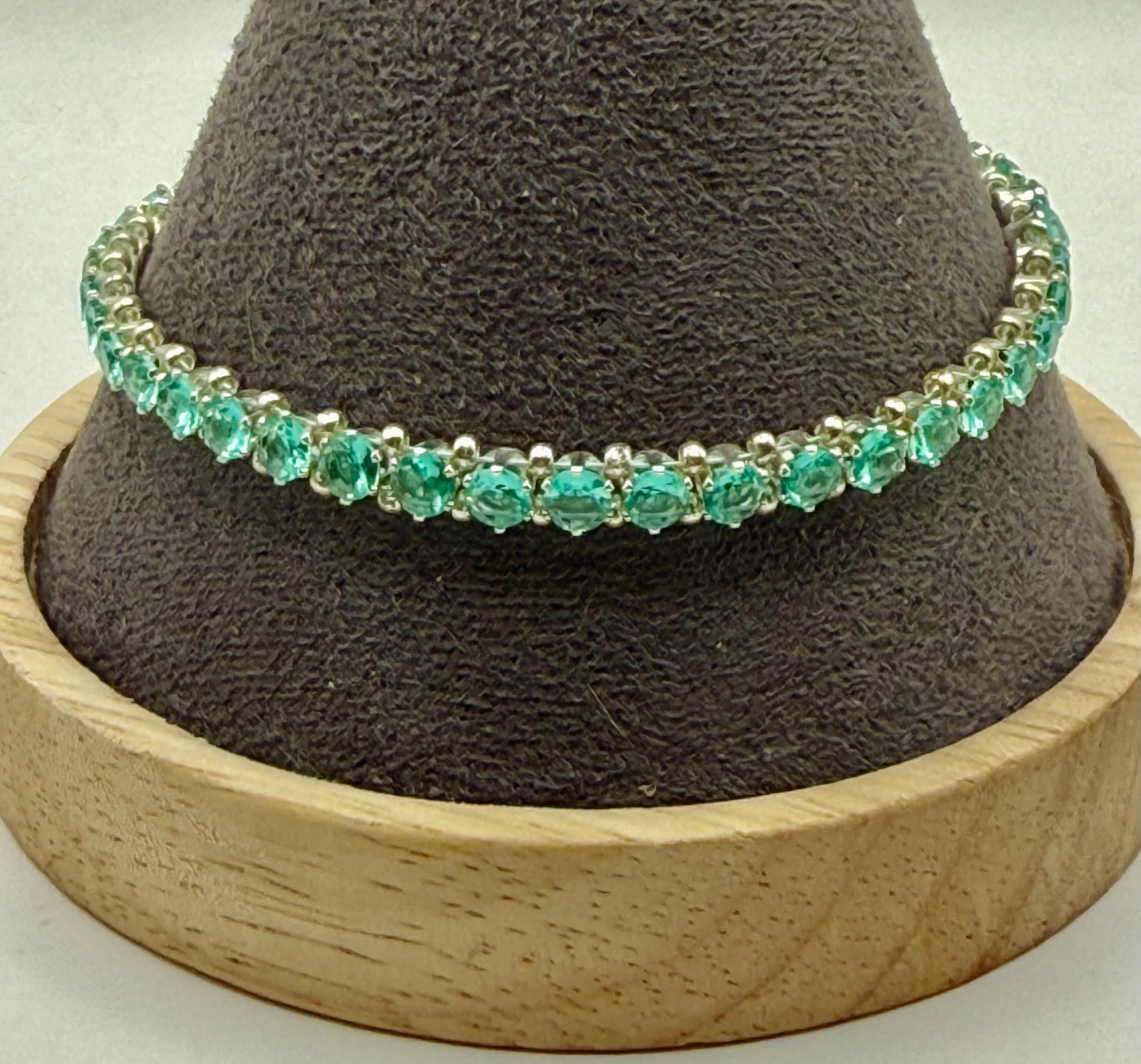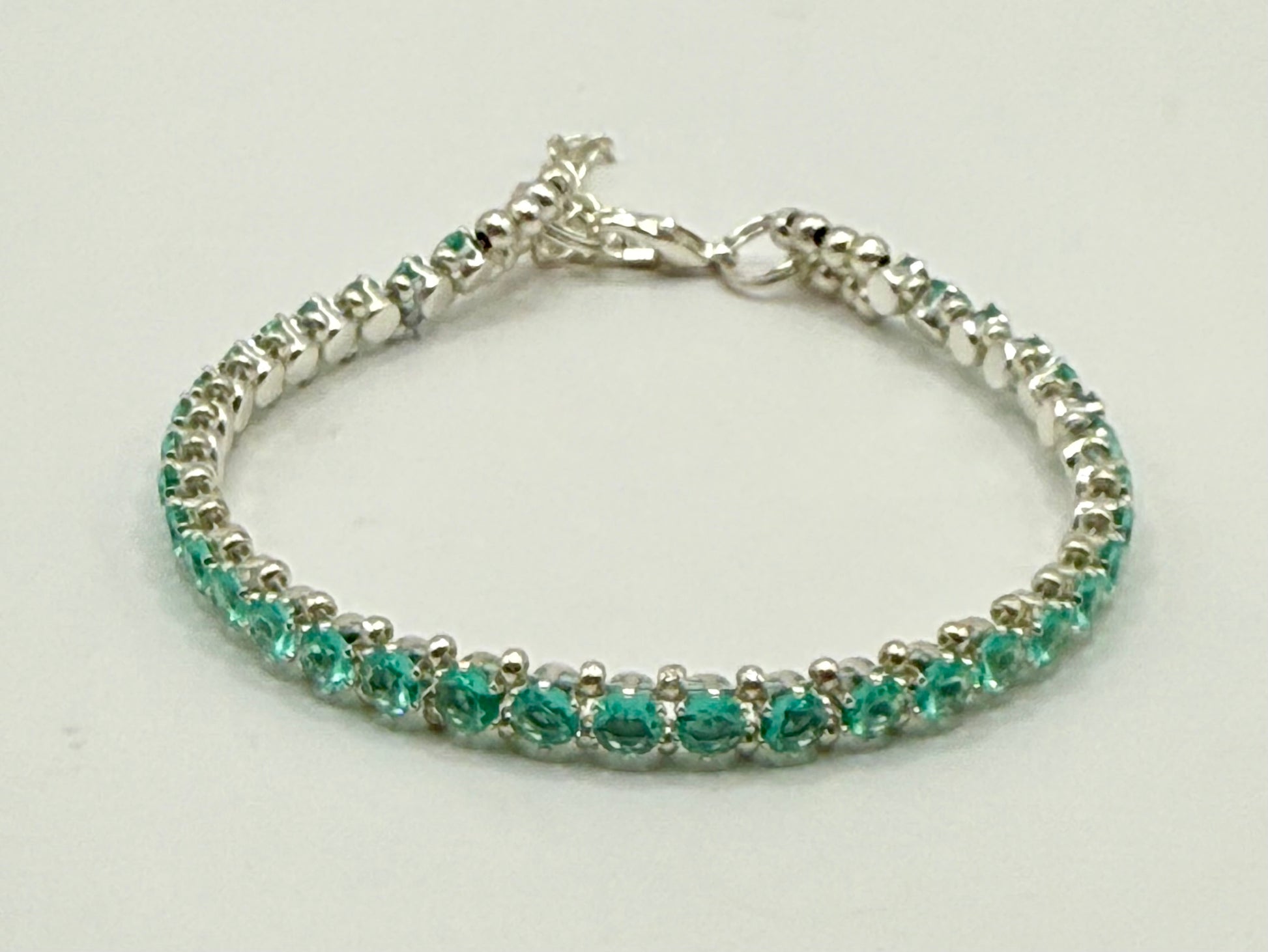 Add a splash of color to your wrist with this stunning 7.25” silver tennis bracelet, hand-crafted with shimmering green crystal beads. Each stone is individually set to catch the light and bring effortless elegance to your look. The bracelet features a secure clasp and a polished finish, perfect for everyday wear or special occasions.