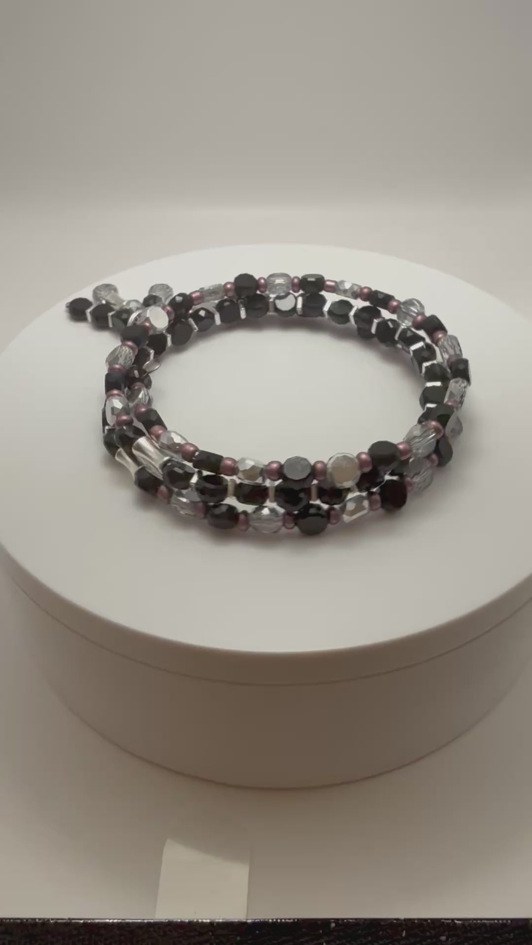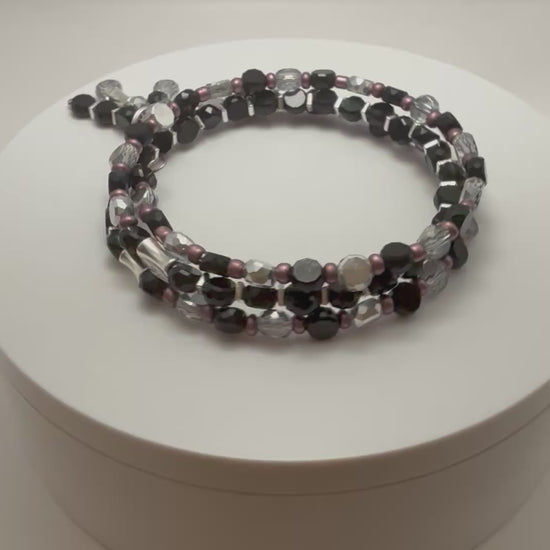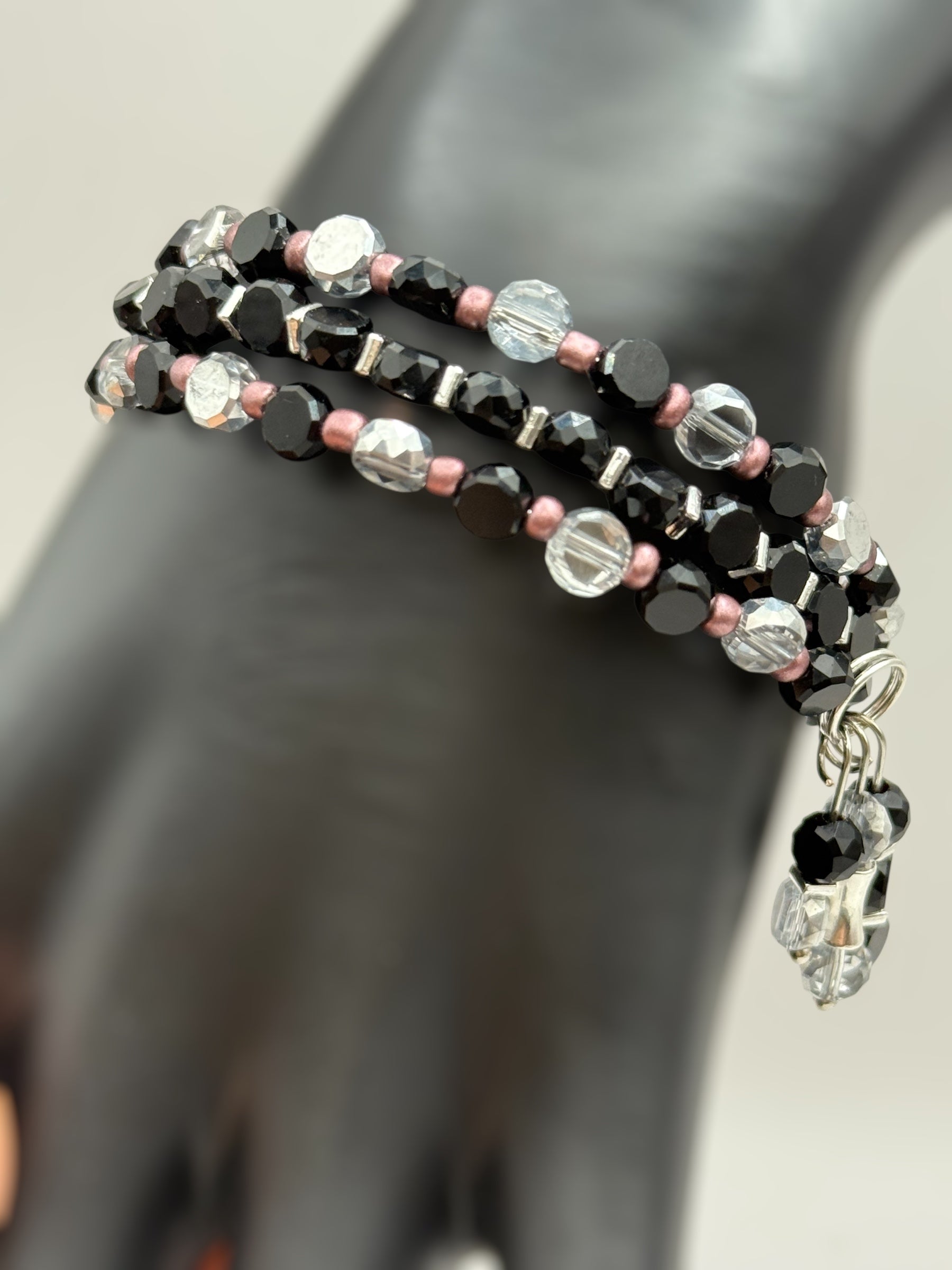 This chic piece features faceted black glass beads, shimmering silver-toned accents, and sparkling clear crystal beads, all woven together on memory wire for a perfect, easy fit. Soft metallic mauve spacer beads add a subtle pop of color and a touch of vintage-inspired elegance.